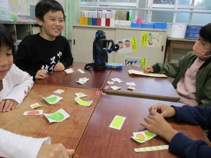 英語活動「サラダで元気」の学習では、野菜の英語の言い方を学習しました。聞きなじみのある野菜もあれば、英語の言い方を初めて知る野菜もあったようです。グループになって自分の好きな野菜を〜,please.を使って伝え合いました。