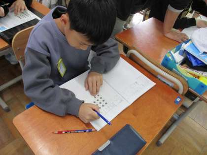 算数科「かけ算(2)」の学習では、数がきちんとそろっていない問題をかけ算を使って考えました。同じ部分を見つけて、かけ算の式を立てて考えていました。1つだけではなく、何通りも考え方を見つけている人もいました。実際に図に書き込んで、式だけでなく言葉でも説明しようと頑張っていました。