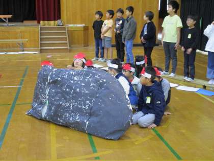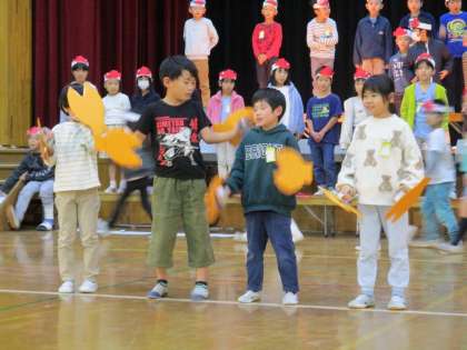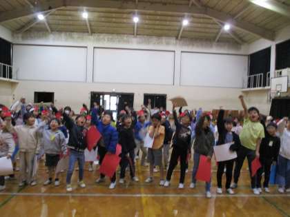 今日が学習発表会前、最後の練習でした。本番さながらの緊張感が漂う中で、通し練習をしました。細かい動きや移動の仕方を確認しました。明日の本番を前に、少し緊張している様子も見られましたが、これまでの練習を信じて最後まで全力で頑張ることを子どもたちと約束しました。最後はみんなで「えいえいおー!」で気合いをいれました。