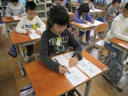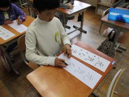 2年生の書写では「元気な子」のフェルトペン書きをしています。文字の通り、元気な子が多い2年生ですが、文字のバランスを考えながら集中して、上手に文字を書けていました。