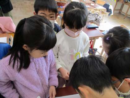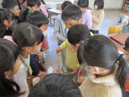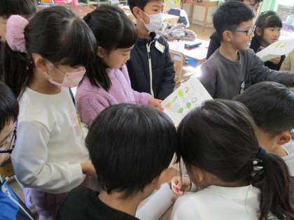 英語活動「サラダで元気」の学習ではt、明徳小学校の先生のためにサラダを作りました。事前に調べた先生たちの好き嫌いを考慮して、欲しい野菜をリストアップし、グループごとにお店屋さんとお客さんに分かれて、欲しい野菜をもらう活動を行いました。「○○,please.」や「How many?」の表現を使って、やり取りできていました。