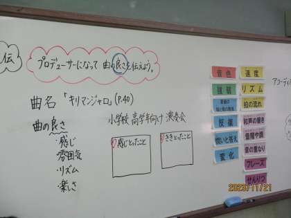 プロデューサーになって曲の良さを伝えることを課題に学習に取り組みました。「キリマンジャロ」という曲のテンポや感じ,雰囲気などの特徴を捉えることを大切に聞き取りをして良さを伝えました。