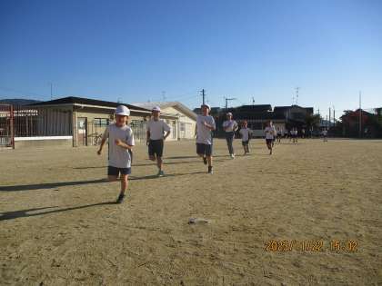 今日は雲1つない青空が広がっていました。縄跳びでは友だちと教え合う様子が見られたり、新しい技に挑戦したりしている子もいます。ペース走では前より同じぺースで走れるようになったとふりかえりで発表している姿も見られました。