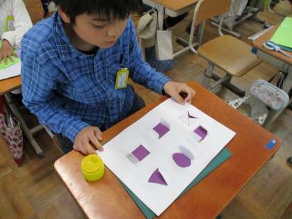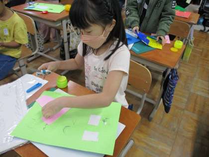 図画工作科「まどからこんにちは」の学習では、まどをカッターナイフで切り、台紙に貼り合わせました。カッターナイフの使い方にも慣れてきて、スムーズにまどをつくることができました。それぞれのまどによって台紙の色を変えたり、飾りをつけたりなど、創意工夫をこらしながら作品づくりをしています。