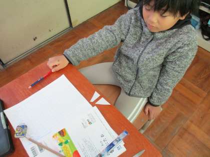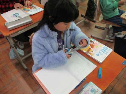算数科「三角形と四角形」の学習では、三角形を直線で二つ分けるとどのような形に切り分けられるか、確かめました。頂点を通っている直線で分けると、三角形が2つできあがり、頂点を通らない直線で切り分けると三角形と四角形が出来上がることに気付きました。