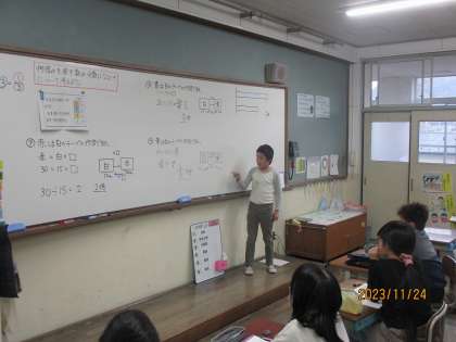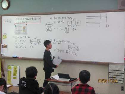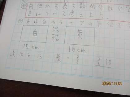 今日は何倍かを分数で表す方法について考えました。問題文の「〜は〜の何倍か」という分から関係図をかいて式を立てました。この分をこれから先も出てくるのでしっかり覚えていこう!!!