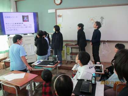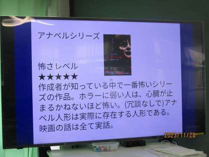 中間休みにホラー係が情報の発信をしてくれました。今日は怖い話をするのではなくて,怖い映画や本の紹介をしてくれました。怖さレベルを星の数で表すなど工夫も見られました。積極的な活動が素晴らしいです!