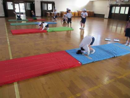 体育科「マットあそび」の学習では、さかの場やかべの場でいろんなわざに挑戦しました。友だち同士で「もっと体丸めたほうがいいよ!」などアドバイスしあって、見合いっこしている様子も見られました。