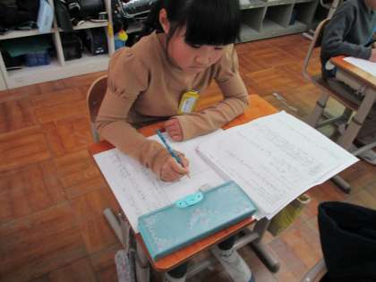 国語科「おもちゃの作り方をせつめいしよう」の学習では、いよいよ自分が決めたおもちゃの作り方の文章を書き始めました。「まず」や「つぎに」などの順序を表す言葉を付け加えたり、「絵のように貼り付けて…」など絵とつなげる言葉を付け加えたりなど、工夫をしながら分かりやすい説明を書いています。