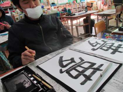 今日は、書き初めをしました。書き初めにふさわしい文字って、どんな文字があるかな?とみんなで出し合いました。「正月」「賀正」「辰」「夢」「山」「光」「餅」「福」「招福」「幸」「もち」「たこ」「こま」など、色々な文字が集まりました。その中から、自分で選んだ文字を心を込めて書きました。