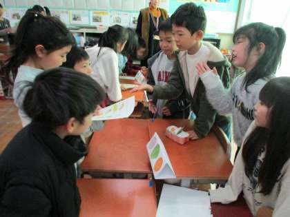 英語活動「サラダで元気」の学習では、明徳小学校の先生のためにサラダを作りました。グループで協力しながら、サラダのために必要な野菜を英語を使ってもらうことができました。大きな声で、数を数えたり、pleaseを使って欲しい野菜を伝えたりなど、積極的に英語を使っている人もたくさんいます。出来上がったサラダを休み時間に先生に届けた子どもたちは「好きなやさいいっぱい入っているしうれしいって言ってもらえた!」「かわいいサラダねって言ってもらった!」ととてもうれしそうな様子でした。いよいよ次は、一人でサラダを作ります。