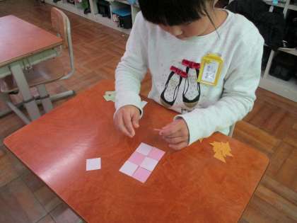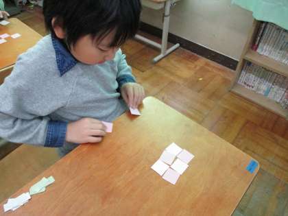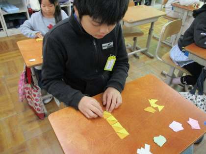 算数科「三角形と四角形」の学習では、正方形・長方形・直角三角形の色紙を使って、さまざまな模様を作りました。正方形と正方形を組み合わせると長方形になったり、長方形と長方形を並べると正方形になったりすることに気付いている人もいました。教室の床を見ても、正方形が組み合わさった模様になっていたり、アスファルトも長方形が組み合わさった模様になったいたりなど、身近にもいろんな形の模様がたくさんあることが分かりました。