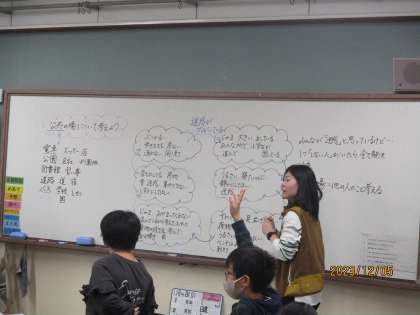 公共の場について考えました。「人の迷惑になるようなことはしない」というのはわかっているけれど誰かがしているとつい流される。迷惑な行動が迷惑な行動を招いてしまっているという考えが子どもたちから出てきました。