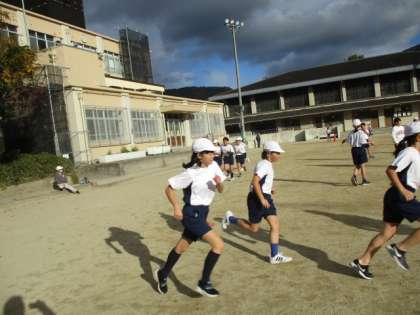 冬の体育の風物詩とでもいうのでしょうか。現在は5分間のペース走をしています。久しぶりに長距離を走るものですから、なかなか思うようなペースでは走れていないようです。それでも回を重ねるごとに自分の走るペースをつかんでくるのか、走るフォームも様になってくる子が増えてきました。両腕をテンポよく振り、足が素直に前に出ます。足音も軽快になってきます。無理せず、自分と同程度の走力の友達と走ることによって、走り方を思い出してくるようです。速く走ったりゆっくりになったりという走り方では、なかなか長距離走の爽快感は味わえません。一定のペースで走り続けることで走力は上がってくるように思います。