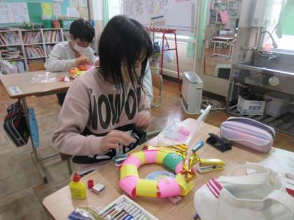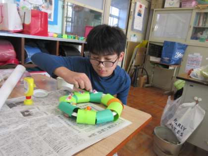 12月12日の「なかよしお楽しみ会」で、プレゼント交換をするためのプレゼント作りをしました。6年生の子どもたちは、図工が大好き。紙皿の回りに、自分で選んだ色の画用紙をホチキスで止めて、その上に、ビーズを貼ったり、リボンを貼ったり、自分で描いた絵を貼ったりして、それぞれの個性豊かなリースが出来ました。