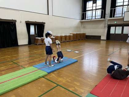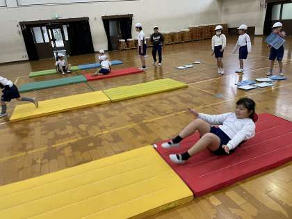体育科「マットあそび」の学習では、いろいろな場で、できるあそびを試したり、もう少しでできそうな技に挑戦したりしました。前回りに挑戦している人がたくさんいて、「もっと頭の後ろをつくんやで!」「おへそを見るといいよ。」など、積極的に声をかけ合っている様子が見られました。