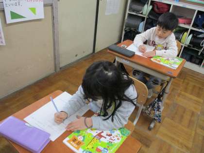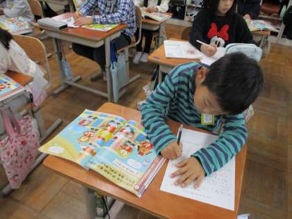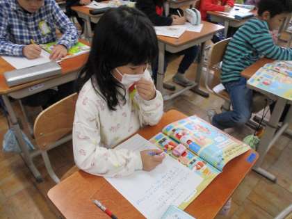 音楽科「いろいろな楽器の音をさがそう」の学習では、打楽器パーティーという曲の鑑賞しました。どんな音が聴こえてくるか、耳を澄まして音楽を聴いていました。タンブリン、すず、ウッドブロック、クラベスなどたくさんの打楽器の音を聞いて、一番好きな音を決めました。「木の音が優しい感じがするからウッドブロックの音が好き。」「タンバリンの音は元気な感じがするから好き。」など、理由も加えて書いている人がたくさんいました。