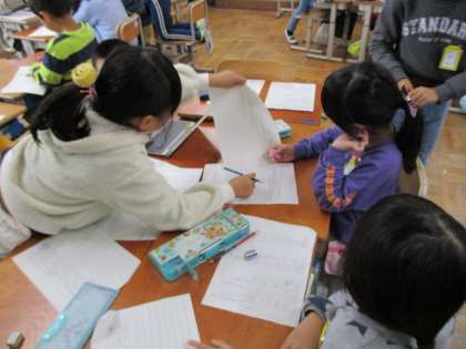 生活科「もっともっとまちたんけん」の学習では、来週の発表に向けて準備を進めています。すでに台本を作り終えたグループもいて、全員で順番に読み合せて、おかしいところがないか確認している人たちもいました。グループで協力しながら準備を進めています。