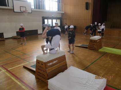 台上前転・かかえこみ跳び・ネックスプリングと徐々に大技へと進む子供が多くなってきました。技の難易度が上がると恐怖心もでてきますがウレタンマットを使ったり友達に励まされたりしながら挑戦しています。少しでも多くの技ができるように頑張ろう!!!