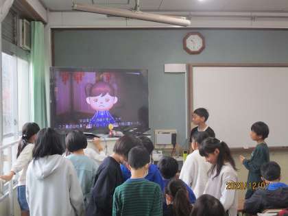 大人気のホラー係!クラスの友達は待ち遠しかったのか多くの友達が集まりました。みんなを引きつけられる工夫がいいですね!