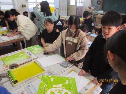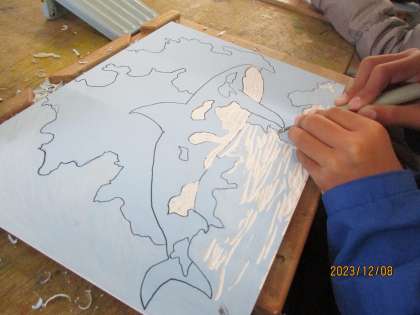 彫刻刀の使い方も回数を重ねるたびに上手になってきました。彫る時に横向きで彫ってしまいがちですが,板の向きを変えて安全に彫っています。安全に彫ることで彫る技術も上がっていきます!確実に成長しています。
