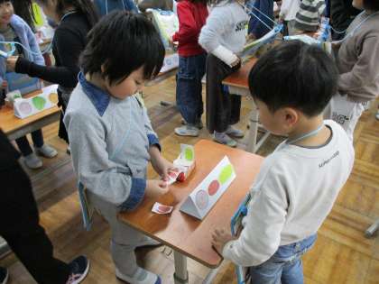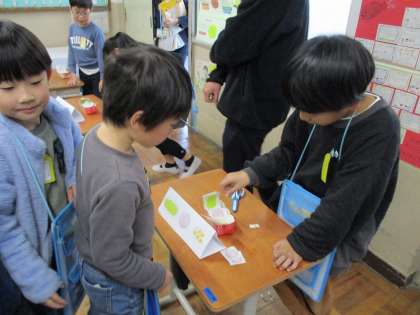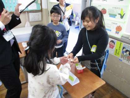 英語活動「サラダで元気」の学習では、オリジナルサラダを作るために、ほしい野菜を英語でのやり取りを通してもらう活動をしました。お店屋さんとお客さんに役割をわけて、欲しい野菜を伝えたり、その数を尋ねたりしました。これまで学習してきた英語使うだけでなく、ジェスチャーを交えたり、相手の目を見ながら確認したりなど、相手に伝わりやすいように工夫している姿が見られました。