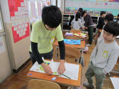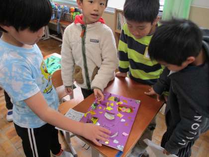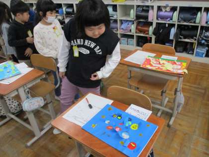 図画工作科「まどからこんにちは」の学習では、友だちの作品を鑑賞しました。友だちの作品の素敵なところを見つけて、感想を書きました。まどの形やまどから出てくるものに着目して、おもしろいところや工夫されているところをたくさん見つけていました。