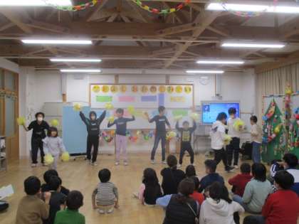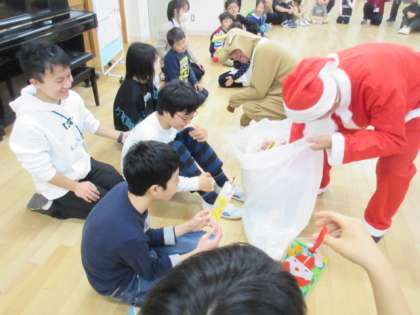 出し物を発表しあった後は、「あわてんぼうのサンタクロース」をみんなで歌い、各校が用意したプレゼントを、サンタとトナカイが配ってくれました。星の子の子ども達は、自分たちの作った可愛らしいリースを受け取ってもらえて、ニコニコと嬉しそうでした。