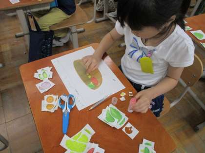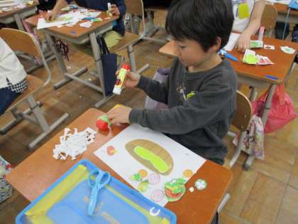 英語活動「サラダで元気」の学習で、もらった野菜たちを切って貼って、盛り付けてサラダを作っています。自分のために可愛く盛り付けている人もいれば、家族のためや友だちのために思いを込めて盛り付けている人もいました。次の時間には、自分が思いを込めて作ったサラダを紹介してもらいます。