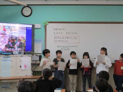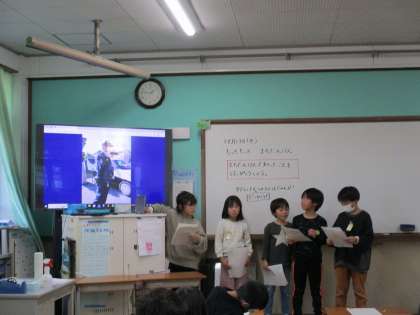 生活科「もっともっとまちたんけん」の学習では、これまで学習してきたことをグループで発表しました。クラスのみんなの前で発表するのは、緊張しているようでしたが、見ている人から「へ〜そうやったんや!」などの反応があると、安心している様子でした。お互いに感想を伝えあったり、さらに質問したりなど楽しく発表会を終えることができました。これからも、地域に愛着をもって過ごしてほしいと思います。