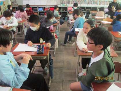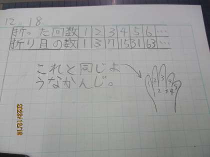 折り紙を使って1回折るたびにできる長方形の数や折り目の数について調べました。実際に折るとすぐに答えはわかるけれど何か決まりがあしそうなことに気付き,増え方に注目して決まりを見つけました。問題を解くだけでなく,友達への説明も上手になってきました。