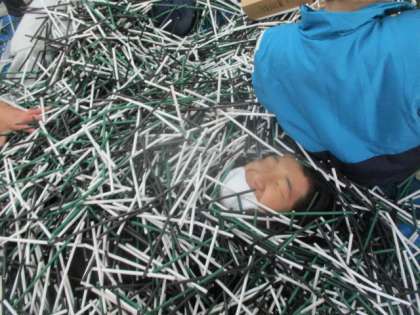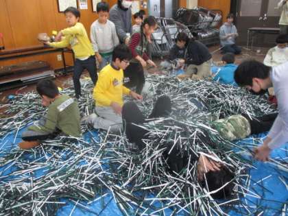 再びミーティングルームへと戻ると、なんと3万本もの紙ストローが子ども達を出迎えました。子ども達はストローにワイヤーを通して不思議な形を作ったり、山盛りのストローの中に潜ってみたり、それぞれの楽しみ方をしていました。ストローで沢山遊んで、第1回目作品作りは楽しく終了しました。