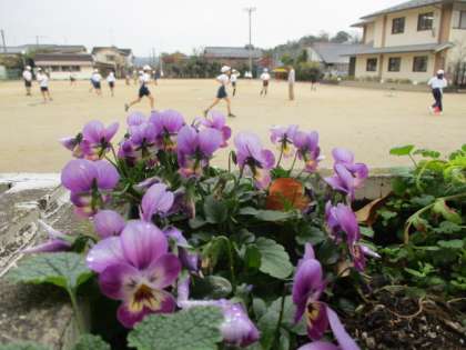 運動場の北にある給食室南側のとても日当たりのいいプランターでは、ビオラたちが子どものペース走や縄跳びを見守っています。気温の高い日が続いていたせいか、例年よりも葉の数が多く、となると花の数も増えています。今週から気温が下がったので、この多くの花たちは冷蔵状態で今の姿を維持することでしょう。咲き続けるビオラに気付く子は、運動場では少ないかもしれませんね。