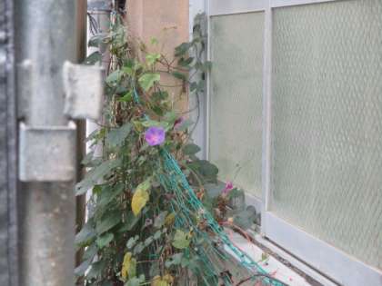 北校舎1階のお手洗いの外側には、今、工事の足場が組まれています。その後ろで、西洋アサガオがまだ咲いています。一般的に開花時期は8月から11月と言われていますので、こちらは長寿命。宿根で水回りのいいところに根付いたせいなのか、去年より長く咲いている気がします。ひょっとしたら年を越すかも、と期待していたのですが、週明けの寒波で花はなくなってきました。もう十分楽しませてくれたのですけどね。