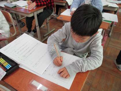 国語科「お話のさくしゃになろう」の学習では、いよいよお話の中心となる「中」の部分を書きはじめました。お話の一番、核となる部分なので、これまでのメモから言葉を足してお話を膨らませて書いています。