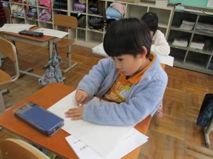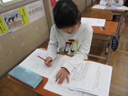 国語科「お話のさくしゃになろう」の学習では、「はじめ」「中」「おわり」のまとまりを意識しながら下書きを書き進めています。登場人物のセリフを増やしたり、分かりやすいように言葉をつけ足したり、工夫しながら書いています。