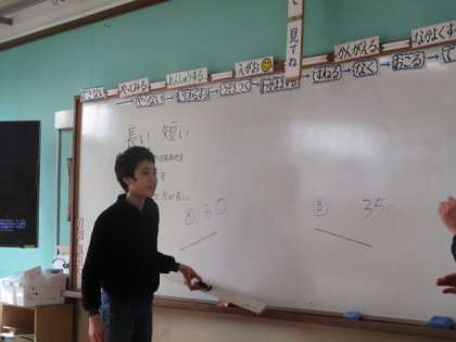 算数では、前回に引き続き、長さについての学習をしました。今回は、長さを測ったり真っすぐな線を引いたりする際の道具として、定規を使うことを知りました。また、真っすぐな線を「直線」、曲がった線を「曲線」ということも学びました。