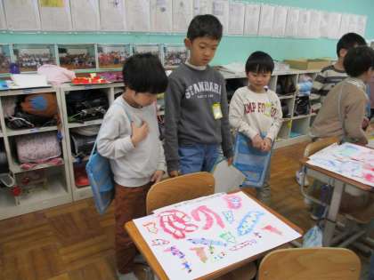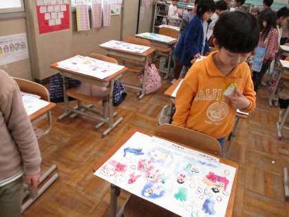 図画工作科「たのしくうつして」の学習では、友だちの作品を見て、よいところやおもしろいところを見つけました。型紙の形や、写すときの工夫点に注目して、お互いの絵を鑑賞し合いました。