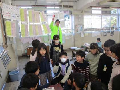 今日の中間休みに、教室にあいさつパトロールをしに、先生が来てくれました。