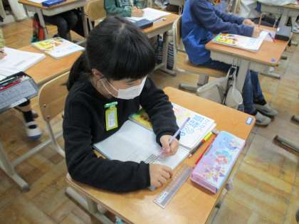 算数科「九九のきまり」の学習では、九九にはない4×12というかけ算の答えの求め方を考えました。かける数が1増えるごとに、4ずつ増えていくということを使って、答えをもとめることができました。図を使って考えたり、式を立てたり、言葉で説明したりと自分なりの考えを持つことができました。