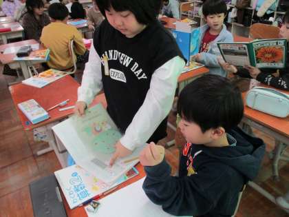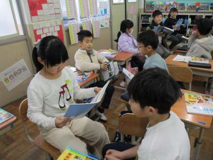 算数科「九九のきまり」の学習では、12×4の答えの求め方を考えました。かけられる数とかける数を入れ替えても答えは同じということを使って、前回の4×12の答えを利用したり、たし算で考えたり、様々な工夫をしていました。