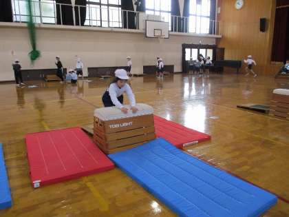 体育科「とびばこあそび」の学習では,もう少しでできそうな技に挑戦している人がたくさんいます。前転がり(台上前転)を練習する場では、できるようになった人が増えました。お互いにアドバイスしながら、切磋琢磨しています。