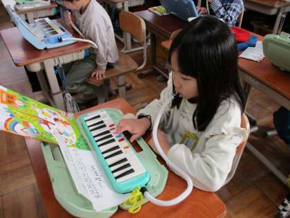 音楽科「ようすをおもいうかべよう」の学習では、鍵盤ハーモニカを吹いたり、歌を歌ったりしました。鍵盤ハーモニカで『こぎつね』の練習をしています。指移動に注意しながら練習しています。『あのね のねずみ』の歌は、歌詞をイメージしながら楽しく歌いました。
