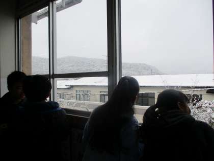 校舎の3階に上がると、窓から雪景色が広がっていました。その絶景を見ながら、2学期に学習した「冬げしき」と「スキーの歌」を歌いました。山に積もった雪がきれいだな、太陽の光が反射してキラキラしている、と話していました。