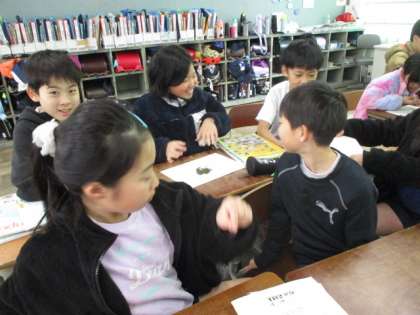ところが、そのお茶の葉の姿を見たことがない、という子どもが大多数。そういえば、たいていのお宅ではやかんにお茶の葉が入ったパックを入れるというお茶の淹れ方です。ですので、茶筒からお茶の葉を取り出し子どもたちに見てもらいました。「いい香りがする。」「甘そう。」という感想と共に、「針みたいに細い。」「よりがかかっている。」と、学習したことに気が付いてくれました。
