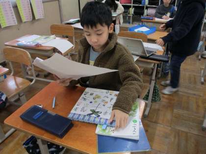 国語科「おにごっこ」の学習では、本を読んであそびを調べています。いろんな遊びを紹介している本を読んで、知らせたい遊びをきめました。次の時間には、遊び方や遊びのおもしろさを調べてまとめ、紹介するために準備していきます。