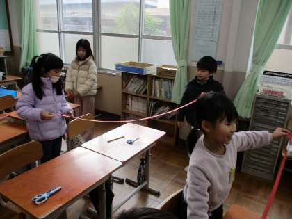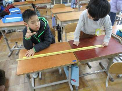 算数科「100cmをこえる長さ」の学習では、1mだと思う長さに紙テープを切って、長さを確かめました。自分の両手を広げた長さをもとにしながら1mを作りました。思っていたよりも長かった人や短かった人などがいました。その中に、1mぴったりを作ったペアがいました。周りのみんなから拍手をもらってとてもうれしそうでした。