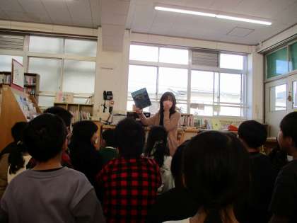 今日は『30000このすいか』という本を読み聞かせしていただきました。この本は、子どもたちからおすすめされた本だそうです。好きな本を見つけると西村先生に報告しにいく人も多いようです。楽しく読み聞かせを聞いていました。