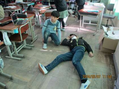 グループでけが人・通報者・救急隊に分かれて、応対の練習をしました。