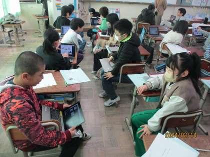 これまで学習した表現を使って自己紹介をしました。英語の表現だけでなく,ジェスチャーもいれながら紹介している子もいました。